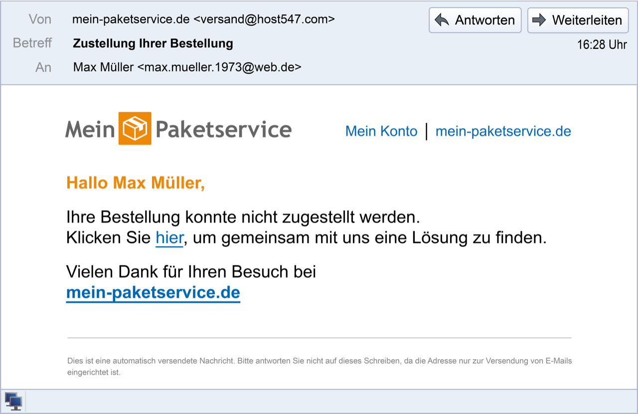 Der Absender in der ersten Zeile verdeutlicht es: Der Absender ist „versand ∂does-not-exist.host547 com“ anstelle von „versand@mein-paketservice.de“.